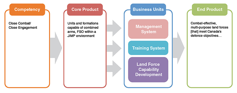 Determining the Army’s core products lies within the strategic context of its employment. The Army’s end product is “…combat-effective, multi-purpose land forces [that] meet Canada’s defence objectives…”44 To provide that product, the Army has branded itself as “the CAF’s centre of expertise for land operations which includes providing the land component of a joint force and preparing other military personnel engaged in land operations.”45 To accomplish its mission and produce the land forces necessary to contribute to CAF operations, the Army fulfills three key functions which allow for the production of those land forces: the development of land force capabilities; the training of Army personnel and units to provide those capabilities; and the management of land force personnel, equipment, and infrastructure in support of those capabilities.
