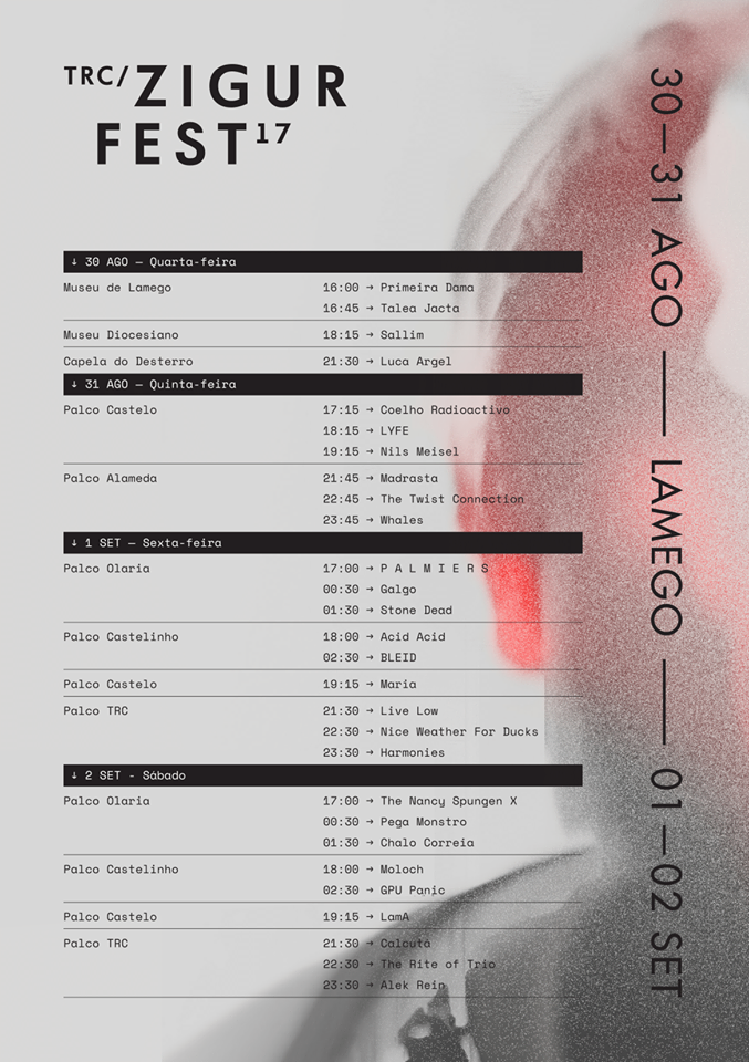 A sétima edição do TRC ZigurFest decorre já nos próximos dias 30 de agosto a 2 de setembro. O festival que invade Lamego conta no seu cartaz com nomes como Alek Rein, Pega Monstro, Live Low, Stone Dead, Galgo, LAmA, Nice Weather For Ducks, Coelho Radioactivo, Calcutá, Acid Acid, Whales, The Twist Connection, Maria, P A L M I E R S, Chalo Correia, The Rite of Trio, , The Nancy Spungen X, Harmonies (Joana Gama, Ricardo Jacinto e Luís Fernandes), BLEID, Moloch, Madrasta, LYFE, GPU Panic e Nils Meisel.